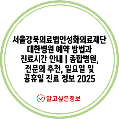 서울강북의료법인성화의료재단 대한병원 예약 방법과 진료시간 공지 | 종합병원, 전연락 추천, 일요일 및 공휴일 진료 정보 2025 에 대해 자주 묻는 질문 TOP 5