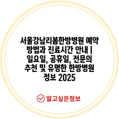 서울강남리봄한방병원 예약 방법과 진료시간 공지 | 일요일, 공휴일, 전연락 추천 및 유명한 한방병원 정보 2025 에 대해 자주 묻는 질문 TOP 5