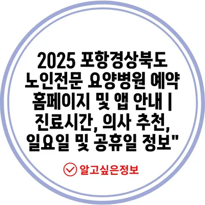 2025 포항경상북도 노인전문 요양병원 예약 홈페이지 및 앱 공지 | 진료시간, 의사 추천, 일요일 및 공휴일 정보에 대해 자주 묻는 질문 TOP 5